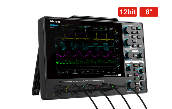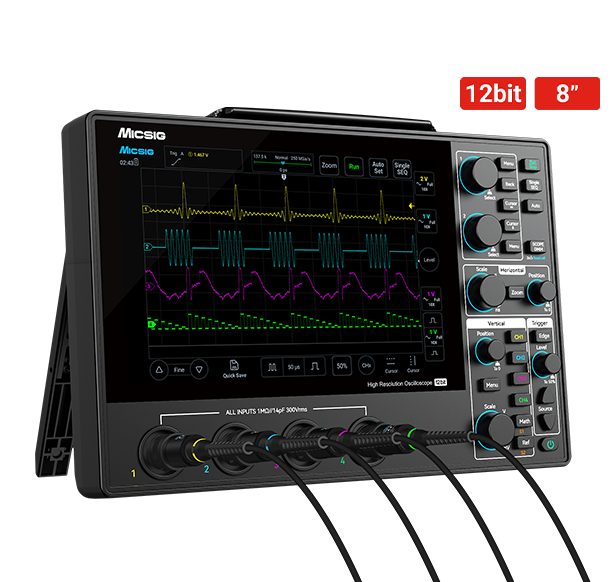 Micsig MHO1 series is an ultra-portable professional-grade high-resolution oscilloscope, equipped with a 12-bit high-precision ADC, featuring a bandwidth of up to 200MHz, 4 analog channels, a real-time sampling rate of 1GSa/s, and a storage depth of 110Mpts. These high-performance parameters ensure that every measurement is accurate and provides a solid foundation for in-depth signal analysis. With a body thickness of only 3.1 cm, it can be easily placed in a backpack for efficient testing anytime, anywhere. It is equipped with an 8-inch high-definition anti-glare touch screen with a resolution of up to 1280*800, offering a delicate and clear picture and responsive touch, bringing users an ultimate operating experience.